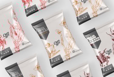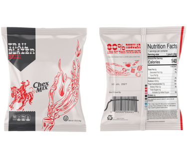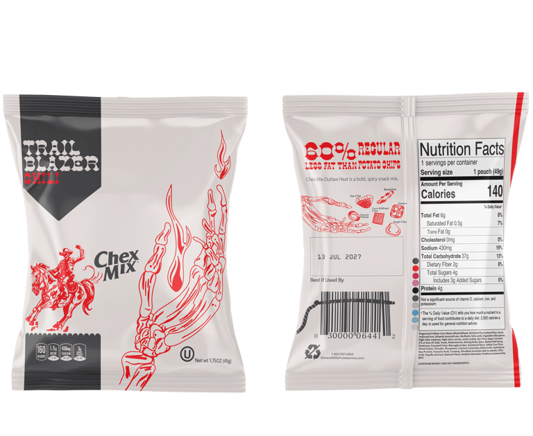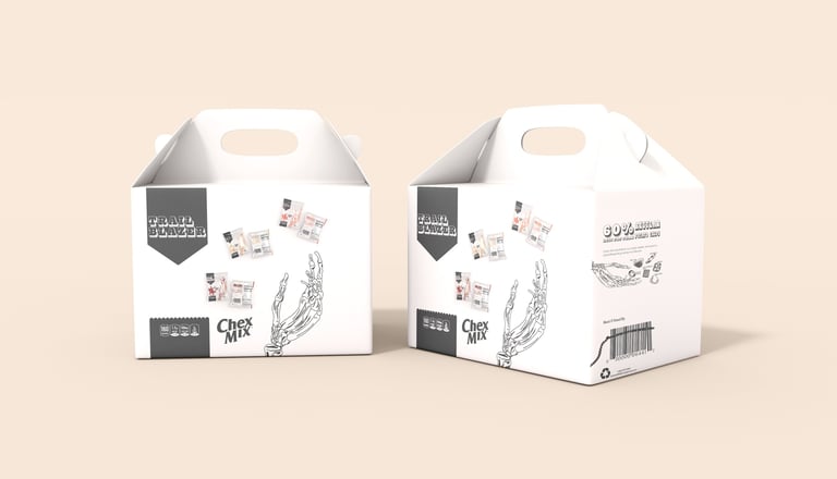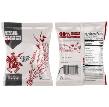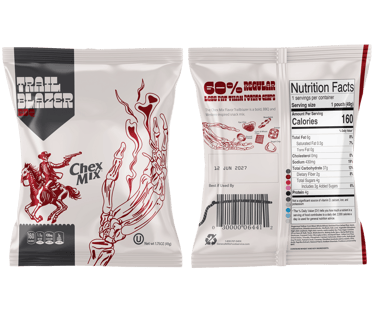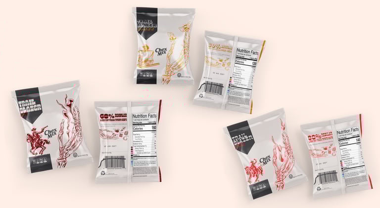 After selecting a snack mix, Chex Mix, the goal was to design three seperate pillow pouches that would have a connection to one theme. With the theme being "Western Skeletons" ideas started coming to life with cowboy skeletons in western settings. Pairing BBQ to the Trailblazer bandit skeleton, Honey to the Goldrush miner skeleton, and Chili to the Outlaw Heat skeleton.