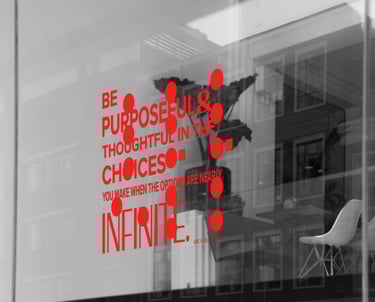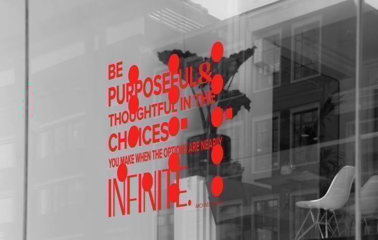 With the inspiration of a graphic designer within the industry in mind, the design decisions were to base around the key aspects of the designer. Michael Bierut, design partner of the world renowned Pentagram agency was the chosen one for this piece. His work embodies boldness and thinking outside the box which was captured through his words in this vinyl piece designed and installed for the art building windows.