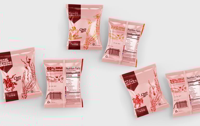 Selecting a snack pack pouch, the brief was to design three different new snack bags for Chex Mix under the same theme. Western skeletons was the theme for which the new flavours BBQ, Honey, and Chili all created a unique snack pack. These could be found in value pack snack boxes and cater to a new demographic.
